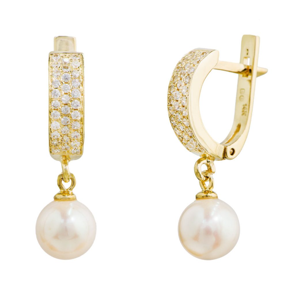 זוג עגילי בננה עשויים זהב צהוב 14K משובצים 3 שורות זירקונים לבנים עם פנינה תלויה אמיתית.