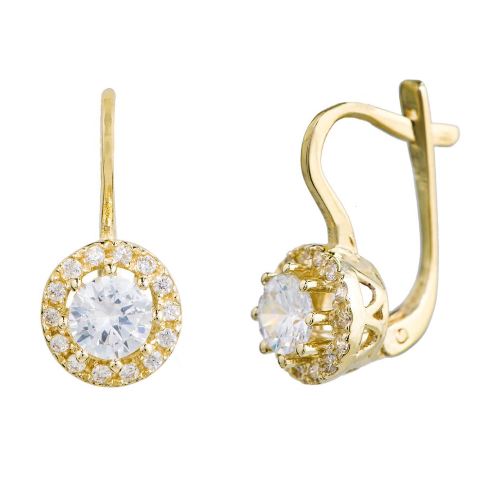 עגילי בננה עשויים זהב צהוב 14K עם זירקון לבן מרכזי וזירקונים סביב, התלי משובץ גם הוא זירקונים לבנים.