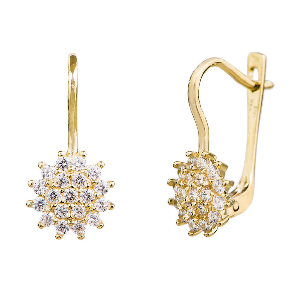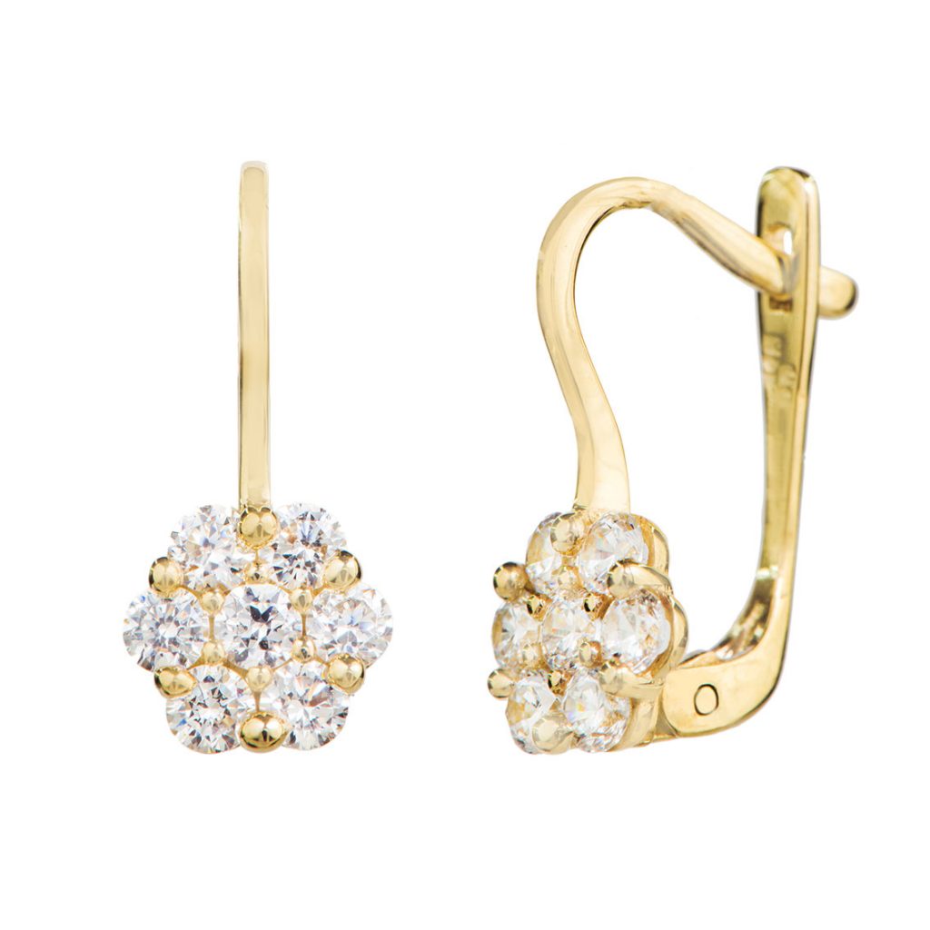 זוג עגילי בננה עשויים זהב צהוב 14K משובצים שבעה זירקונים לבנים המייצרים יחדיו פרח.