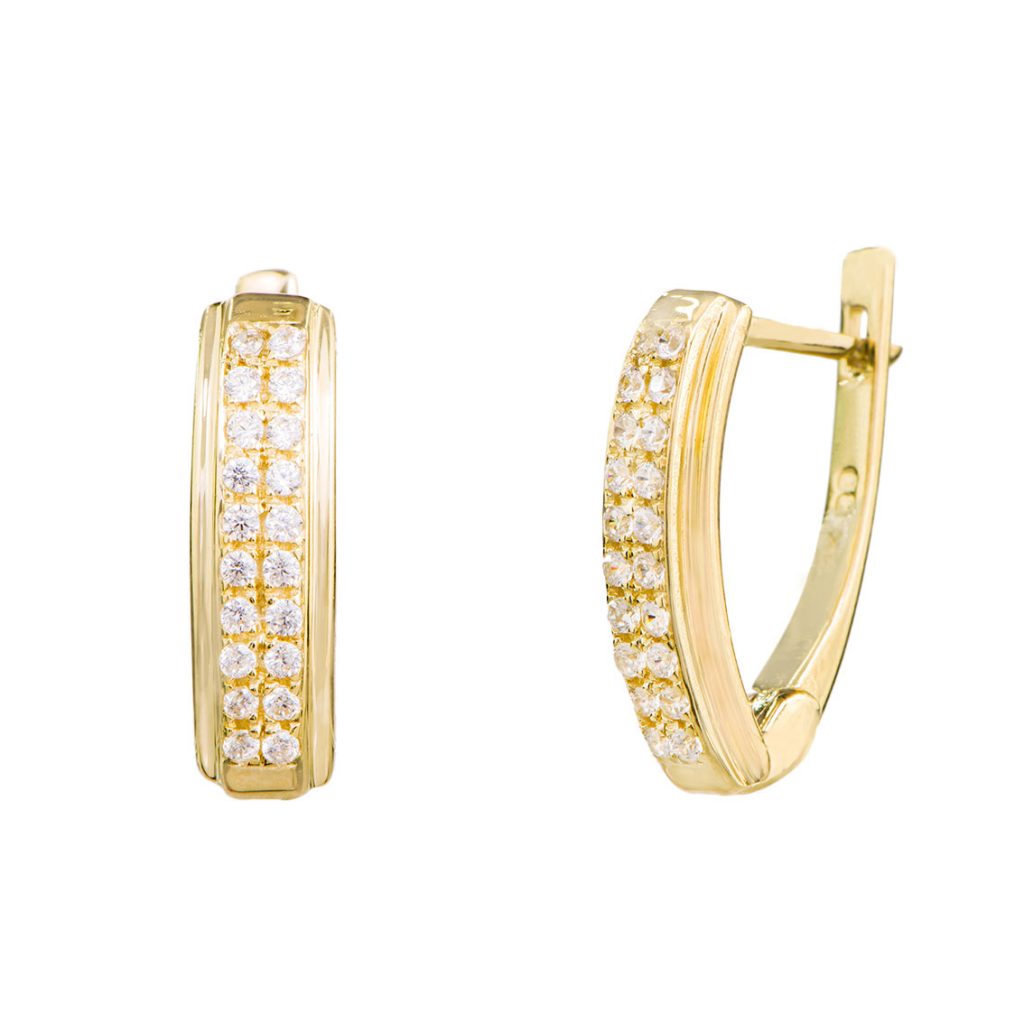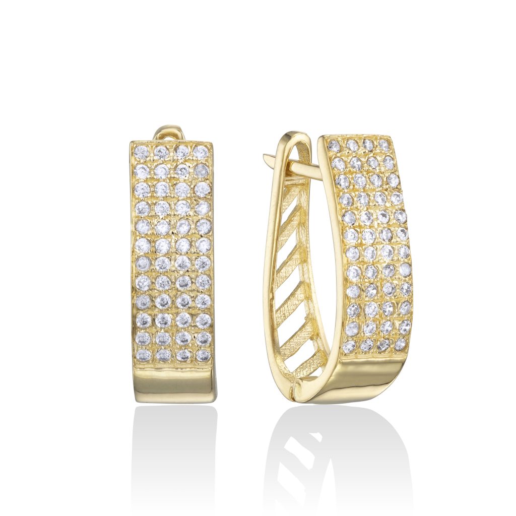 זוג עגילי בננה בעיצוב קלאסי ועדין עשויים זהב צהוב 14K משובצים שתי שורות זירקונים לבנים