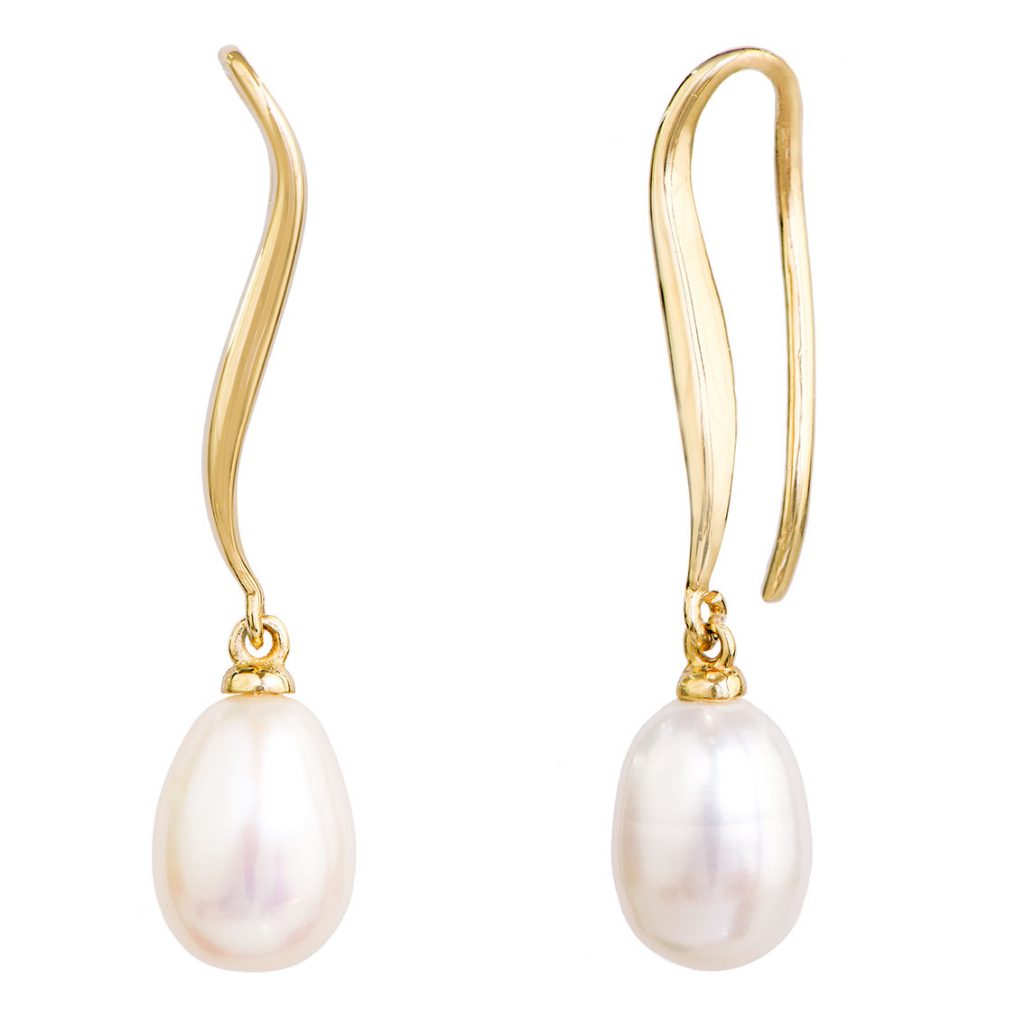 זוג עגילי פנינים תלויים עשויים זהב צהוב 14K במראה אלגנטי ועדין משולבים פנינים לבנות אמיתיות