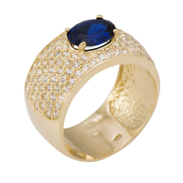 טבעת משובצת שבע שורות זירקונים לבנים עשויה זהב צהוב 14K במרכזה אובל קורונדום בצבע כחול. את האבן המרכזית ניתן לקבל במגוון צבעים.