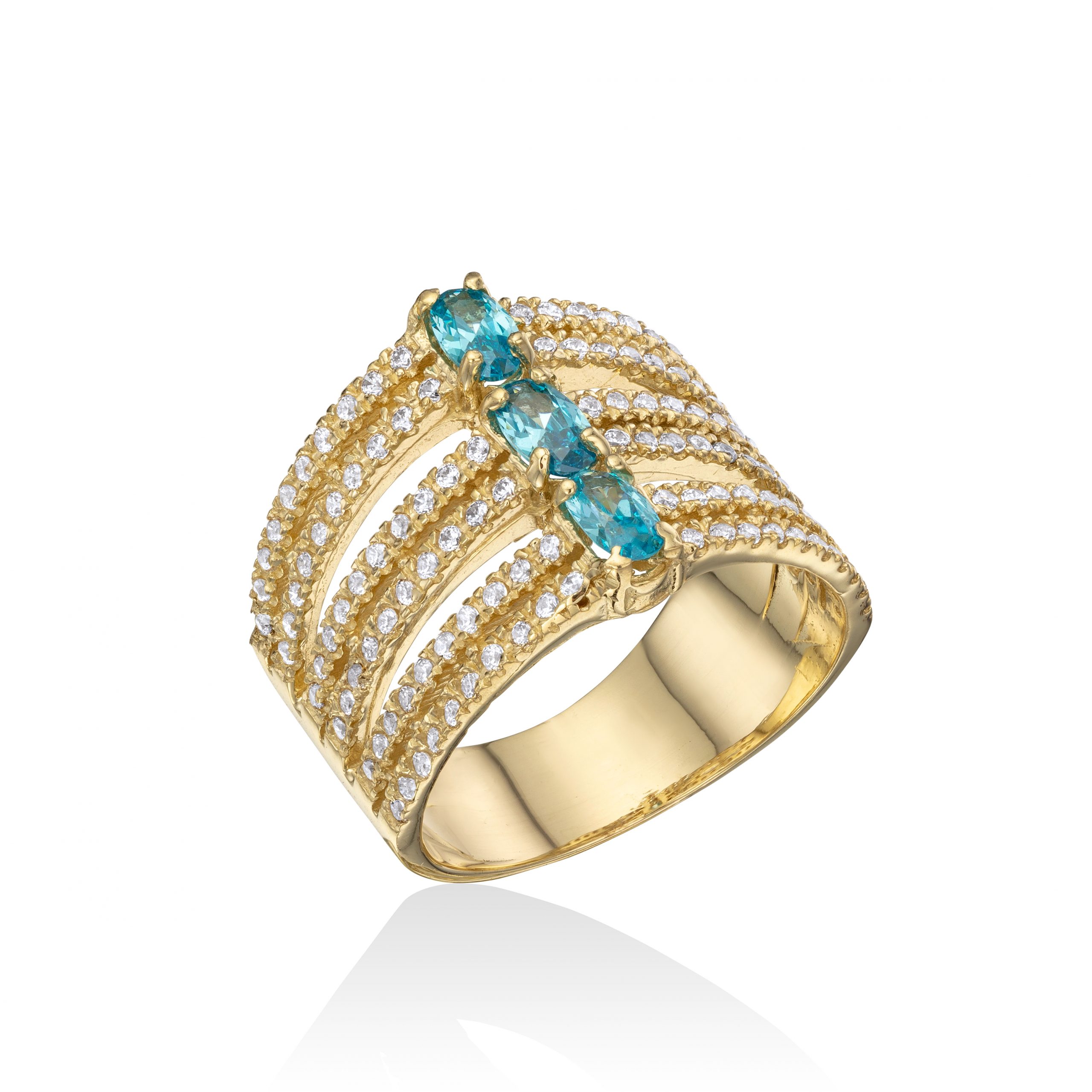 טבעת זהב 14K במרכזה משובצות שלוש אבני בלו טופז אובליות (או אבן אחרת לבחירת לקוח) כשלכל אחת מהן חוברות שתי שורות בשיבוץ אבני זירקון לבנות