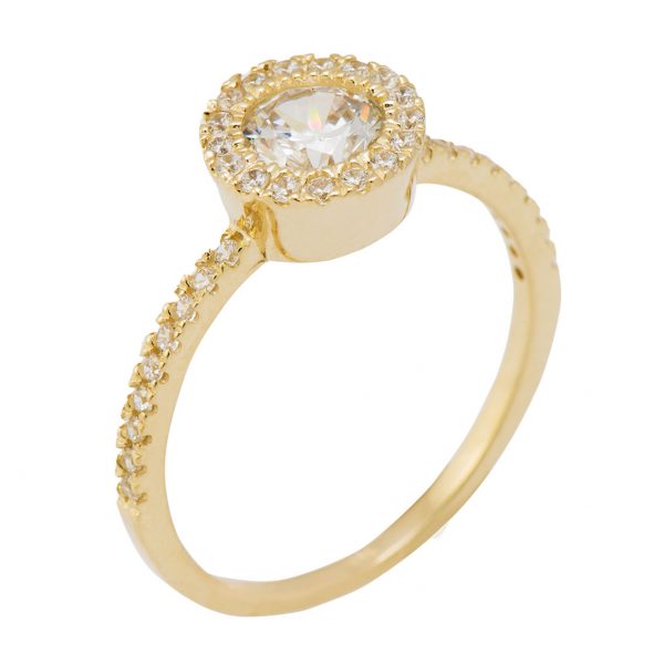 טבעת זהב צהוב 14K משובצת אבן זירקון לבנה מרכזית ואבני זירקון לבנות סביב ומשני צידיה.