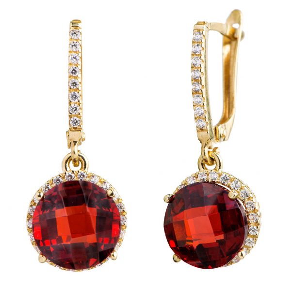 עגילים תלויים זהב צהוב 14K בשיבוץ זירקונים לבנים במרכז אבן זירקון בצבע גרנט (אדום) התלי משובץ זירקונים לבנים האבן המרכזית ניתנת לבחירה במגוון צבעים