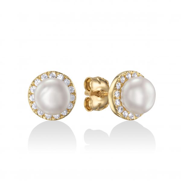 זוג עגילי זהב 14K צמודים משובצים אבן פנינה לבנה אמיתית בשיבוץ זירקונים סביב
