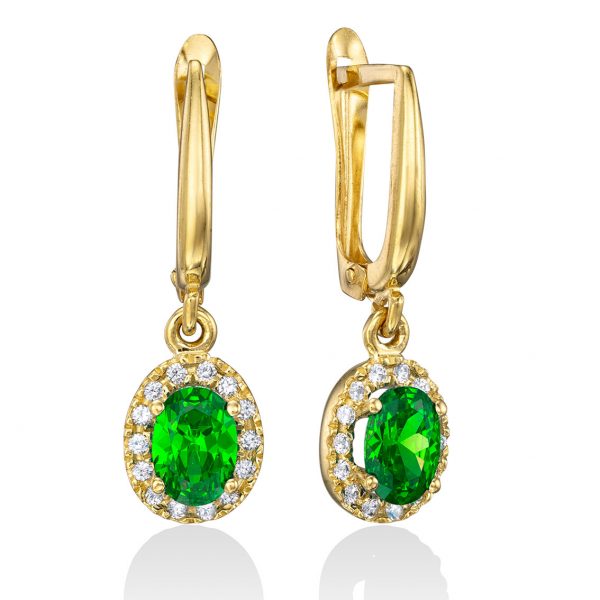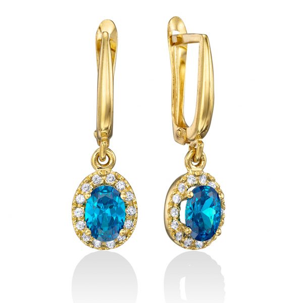 זוג עגילי זהב 14K תלויים בשיבוץ אבן מרכזית אובלית בצבע לבחירת לקוח בשיבוץ אבני זירקון לבנוות סביב