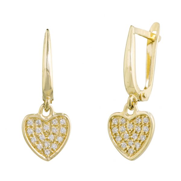 עגילים תלויים עשויים זהב צהוב 14K בצורת לב משובצים זירקונים לבנים