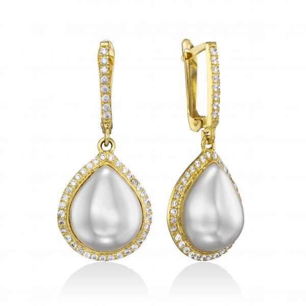 זוג עגילי זהב 14K תלויים משובצים אבן פנינה לבנה אמיתית ואבני זירקון לבנות סביב התלי משובץ גם הוא אבני זירקון לבנות