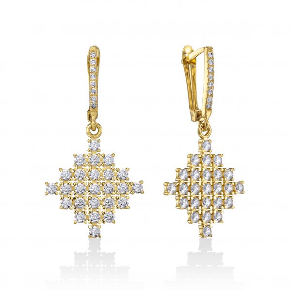זוג עגילי זהב 14K תלויים בצורת מעויינים משובצים אבני זירקון לבנות או שחורות לבחירת לקוח