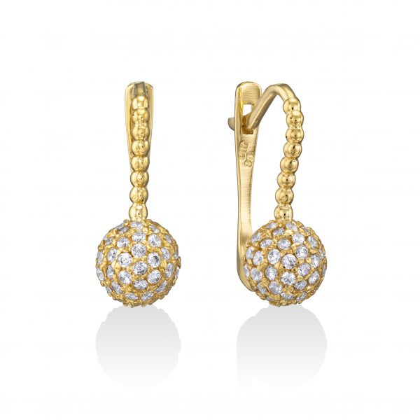 זוג עגילי זהב 14K בננה המשובצים אבני זירקון בנות על בסיס חצי כדור התלי משובץ גם הוא אבני זירקון לבנות