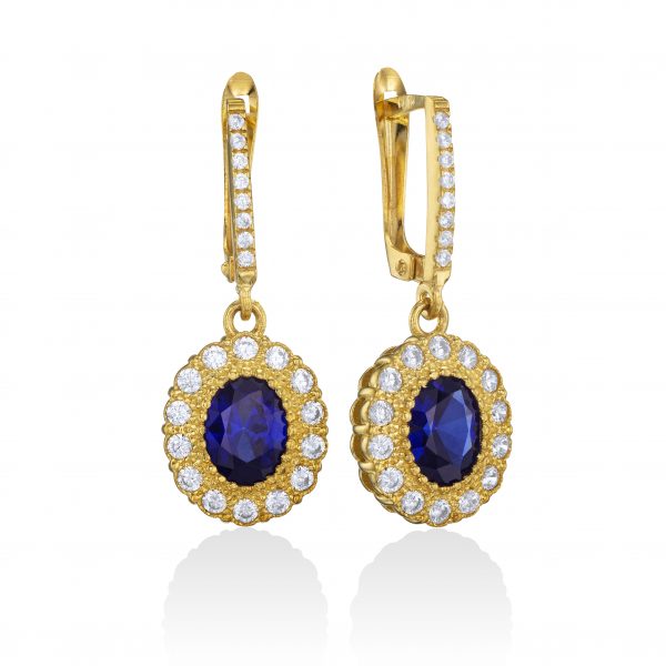 זוג עגילי זהב 14K תלויים משובצים אבן אובלית מרכזית בצבע לבחירת לקוח בשיבוץ אבני זירקון לבנות סביב ולאורך התלי