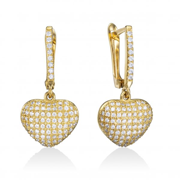 זוג עגילי זהב 14K תלויים בצורת לב משובצים אבני זירקון לבנות התלי משובץ גם הוא אבני זירקון לבנות