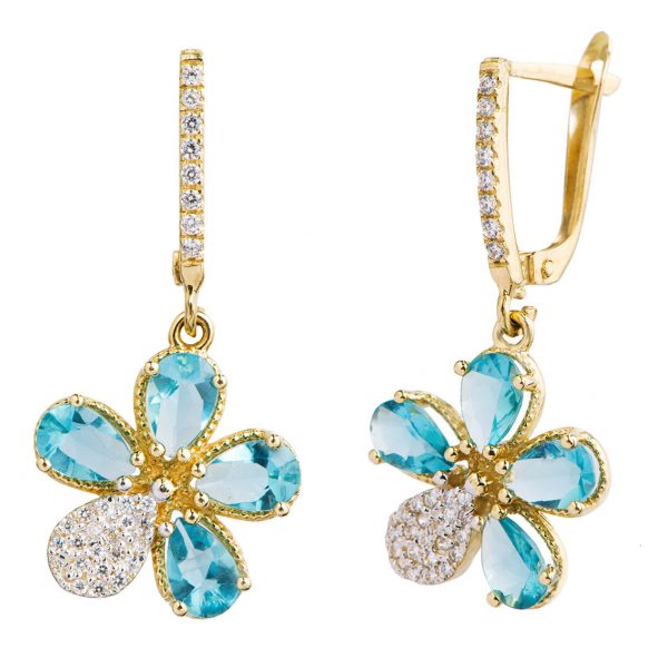 זוג עגילים תלויים עשויים זהב צהוב K14, משובצים ארבע אבני בלו טופז תכולות שביחד עם זירקונים לבנים ומנצנצים על העלה והתלי – יוצרים פרח מושלם. לצבעוניות שביניכן, ניתן לקבל את עלי הכותרת בצבעים שונים וליהנות מעגיל צבעוני.