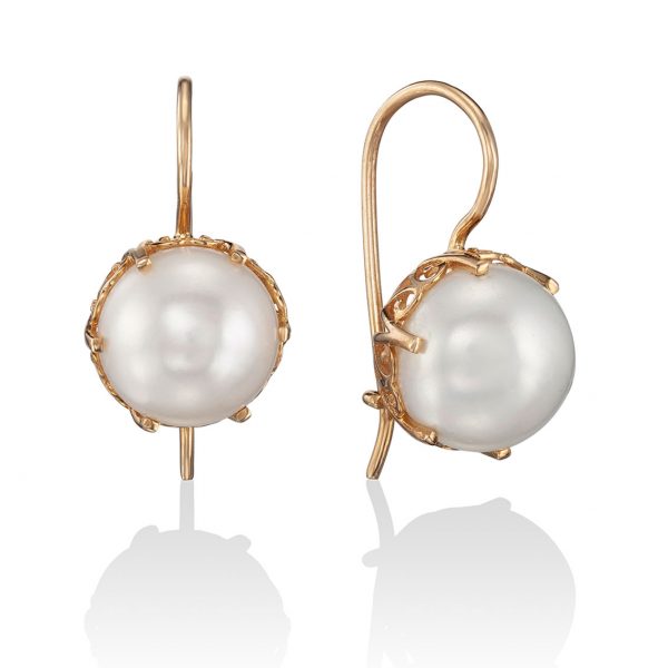 זוג עגילי זהב 14K בננה בשיבוץ אבן מרכזית רדיאלית פנינה אמיתית בשיבוץ כוס מעוטרת – ניתן לבחור לשיבוץ גם אבן ירוקה "ג'אד" אבן "אוונטורין" או אבן גראנט אדומה.