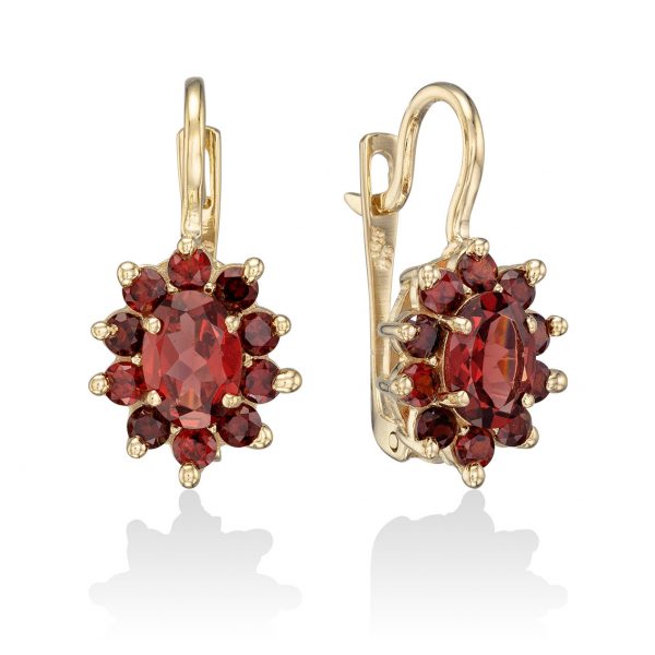 זוג עגילי זהב 14K בננה בשיבוץ אבן מרכזית אובלית ועשרה אבנים סביב, גוון האבנים לבחירת לקוח.