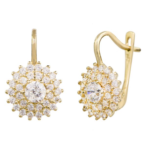 זוג עגילי בננה עשויים זהב צהוב 14K משובצים זירקונים לבנים בשיבוץ מעגלי