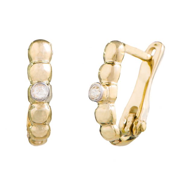 עגילי בננות זהב צהוב 14K מעוטרות בעיגולים ומשובצות באבן זירקון לבנה סביבה זהב לבן 14K