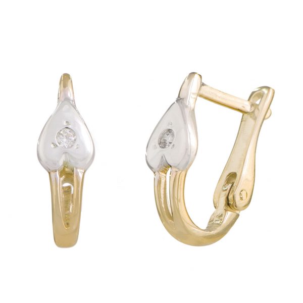 זוג עגילי בננות עשויים זהב צהוב 14K בשילוב זהב לבן 14K בשיבוץ זירקון מרכזי