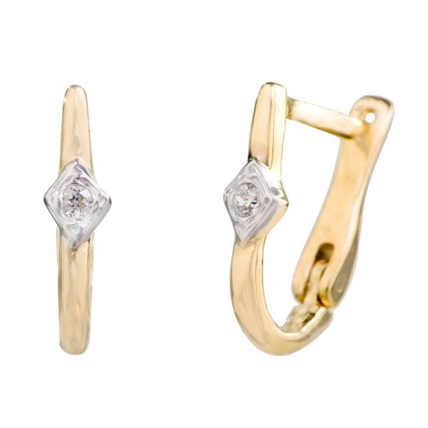 עגילי בננות זהב צהוב 14K מעוטרות מעוין מרכזי בזהב לבן 14K בשיבוץ זירקון לבן