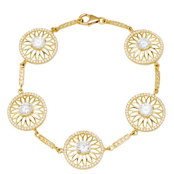 צמיד ובו חלקים עגולים המשובצים זירקונים לבנים עשוי זהב צהוב 14K במרכזם אבן זירקון עם קושרות עלי כותרת בין החלקים העגולים קושרות מלבניות.