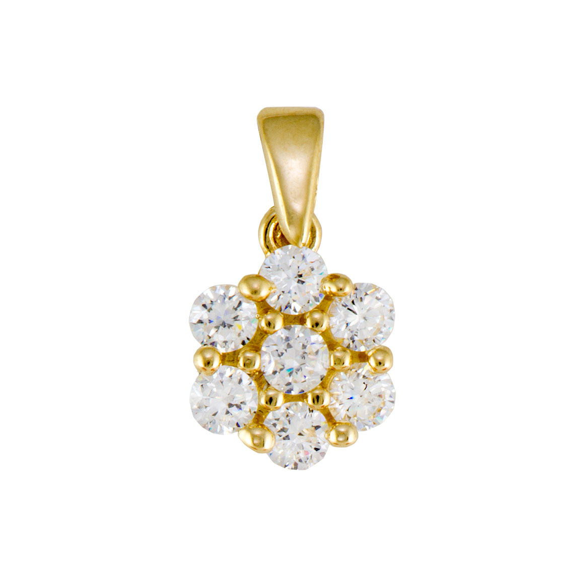 תליון זהב צהוב K14, משובץ שבעה זרקונים לבנים המייצרים יחדיו פרח.